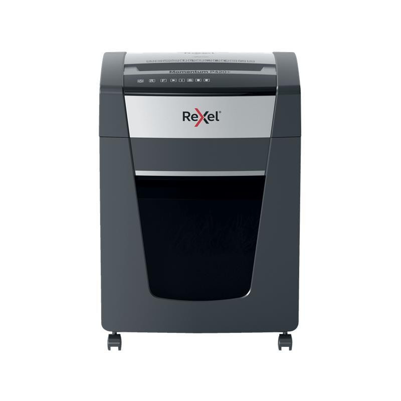 La destructora de papel Rexel Momentum Extra P420+ es ideal para la destrucción segura y eficiente de documentos confidenciales en la oficina.