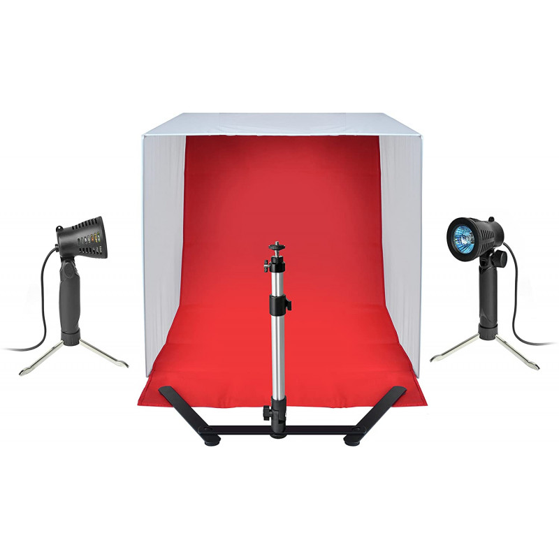 El set de fotografía de productos Bresser BR-2118B de 60x60x60 cm incluye una práctica caja de fotografía plegable con lados difusos de color blanco lechoso que reducen los reflejos al fotografiar productos. La caja de almacenamiento se puede plegar y guardar fácilmente. También es ideal para llevar. El set incluye 4 fondos (120 cm x 60 cm) en los colores blanco, negro, azul y rojo, que se pueden fijar fácilmente a la caja con velcro. Los productos se pueden iluminar con las dos lámparas halógenas de 50 W que incluyen un trípode de mesa y un práctico cabezal basculante. Se suministra un trípode estable con una altura máxima de 28 cm para el montaje de accesorios adicionales. Gracias a la rótula, los accesorios montados se pueden colocar de forma flexible en cualquier dirección deseada. También existe la opción de inclinar toda la varilla del trípode. Con este conjunto puede comenzar de inmediato.