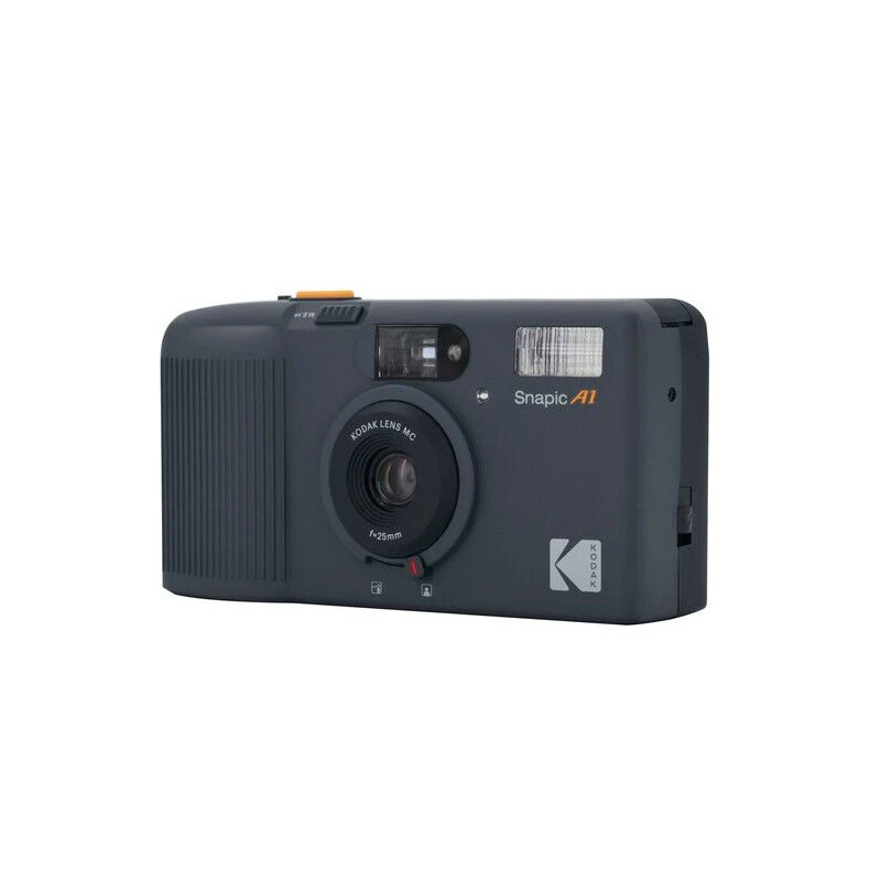 Una cámara compacta moderna de 35 mm con un objetivo gran angular de 25 mm de cristal, la Snapic A1 35 mm de Kodak es una compacta para llevar recuerdos en cualquier lugar. El enfoque manual de dos zonas permite un ajuste rápido entre los ajustes de paisaje y primer plano, y un flash incorporado permite una exposición adecuada con poca luz.