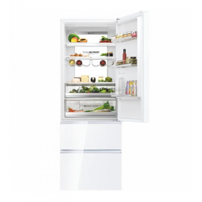 El frigorífico Haier HTW7720DNGW es un avanzado electrodoméstico que combina un diseño elegante con la tecnología más puntera para el cuidado de tus alimentos. Con una clasificación energética D, garantiza un rendimiento eficiente y un consumo energético reducido de 242 kWh/año, ayudando a proteger el medio ambiente y tu bolsillo.