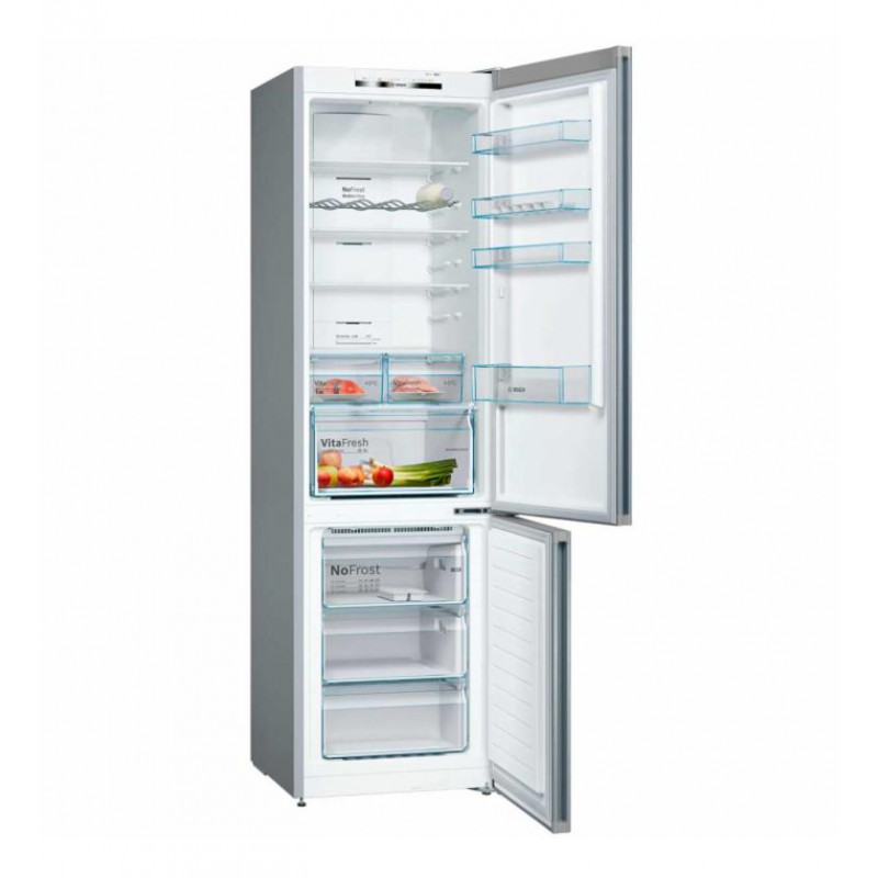 El frigorífico combi Bosch KGN39VIDA es la solución ideal para aquellos que buscan un electrodoméstico eficiente, espacioso y con las últimas innovaciones en conservación de alimentos. Con una capacidad neta total de 400 litros, distribuidos en 279 litros para el frigorífico y 87 litros para el congelador, ofrece amplio espacio para todas tus compras.