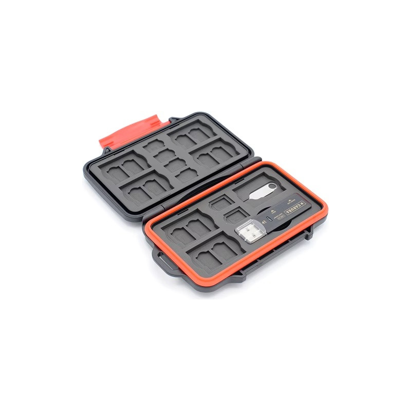 El robusto Caruba Multi Card Case MCC-7 es una práctica caja de almacenamiento para 7 tarjetas SD, 16 micro SD, 2 micro SIM y 2 nano SIM, incluido un rápido lector de tarjetas USB 3.0. A través del almacenamiento