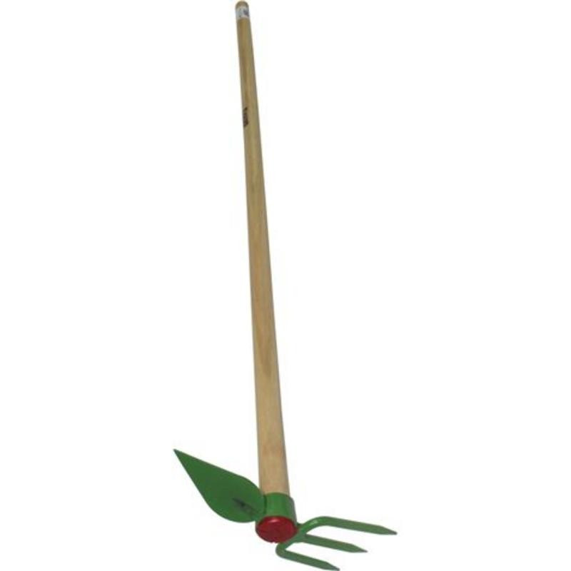 La cabeza del sacho, forjada en acero de alta calidad, presenta una punta en lanza ideal para romper y cavar terrenos compactos, mientras que sus tres dientes tipo rastrillo, con un ancho de 26 cm, son perfectos para remover, airear y nivelar la tierra con eficacia. El mango, fabricado en madera barnizada, ofrece un agarre cómodo y una resistencia superior, asegurando una vida útil prolongada incluso con uso intensivo.