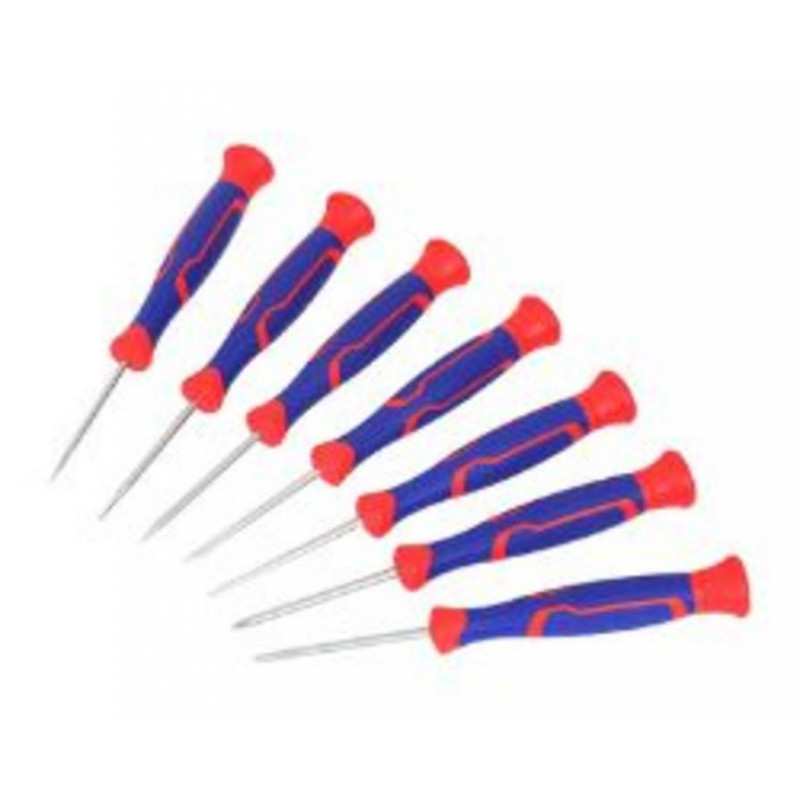 Juego de destornilladores de precisión Workpro. Incluye 3 Philips y 4 planos. Puntas magnéticas y cuerpo de cromo-vanadio para mayor durabilidad y precisión. Ideal para trabajos de electrónica y reparación.