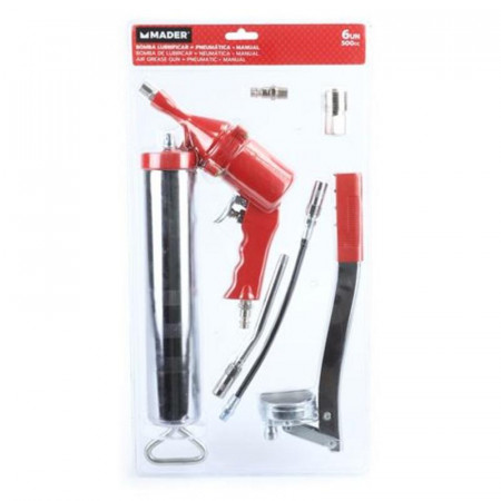 Optimiza tus tareas de mantenimiento y lubricación con la bomba engrasadora Mader de 500cc. Esta herramienta robusta y fiable está diseñada para ofrecer la máxima flexibilidad, permitiendo su uso tanto de forma neumática, para trabajos rápidos y con menor esfuerzo, como de forma manual, ideal para situaciones que requieren mayor control o cuando no se dispone de aire comprimido.