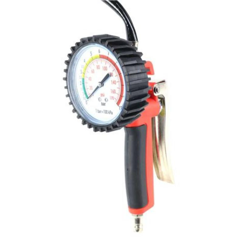 Fabricada para ofrecer durabilidad y precisión, esta pistola de inflado es ideal para todo tipo de vehículos, desde coches y furgonetas hasta motocicletas y bicicletas. Su manómetro integrado te permite leer la presión de forma instantánea y exacta, asegurando que tus neumáticos siempre estén en óptimas condiciones.