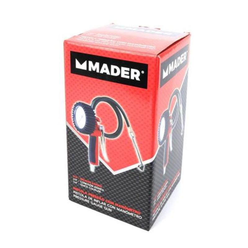 Mantener la presión adecuada en los neumáticos es crucial para la seguridad en la carretera y la eficiencia del combustible. Con la Pistola de Inflado con Manómetro Mader 1/4, tendrás el control total al alcance de tu mano. Diseñada para ser robusta y fácil de usar, esta herramienta es un complemento indispensable para cualquier compresor de aire.