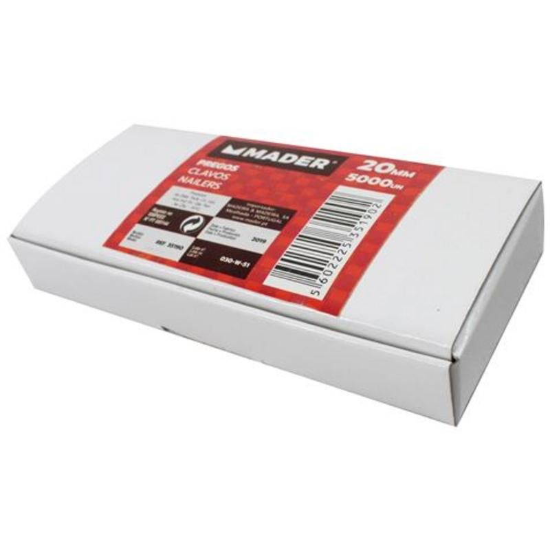 Optimiza tus proyectos de bricolaje y carpintería con la caja de 5000 clavos Mader de 20mm. Estos clavos, esenciales para cualquier caja de herramientas, están diseñados para ofrecer una fijación segura y duradera en una variedad de aplicaciones con madera y materiales ligeros.
