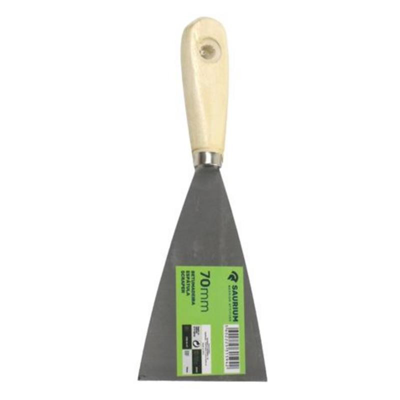 Su hoja de acero al carbono, de 70mm de anchura, proporciona la flexibilidad necesaria para trabajar con precisión y eficacia, adaptándose a diferentes texturas. El robusto mango de madera garantiza un agarre cómodo y seguro, permitiendo un control óptimo durante su uso prolongado.
