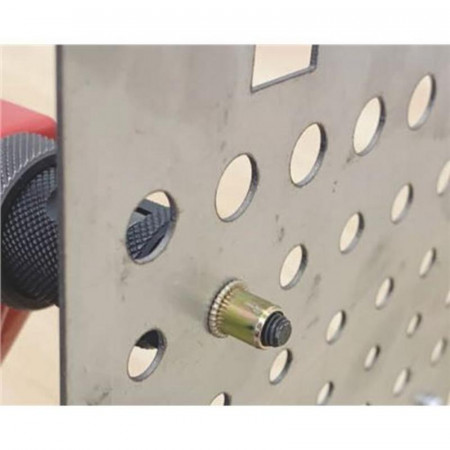 El kit completo incluye 7 adaptadores intercambiables que cubren las medidas más comunes, desde M3 hasta M12, lo que te permite trabajar con diferentes tamaños de tuercas para una variedad de proyectos. Ya sea que necesites unir piezas metálicas, reparar estructuras o realizar trabajos de carrocería, esta herramienta te proporcionará una unión fuerte y duradera. Además, viene con un juego inicial de tuercas en cada medida y una llave para un fácil montaje y desmontaje de los adaptadores.