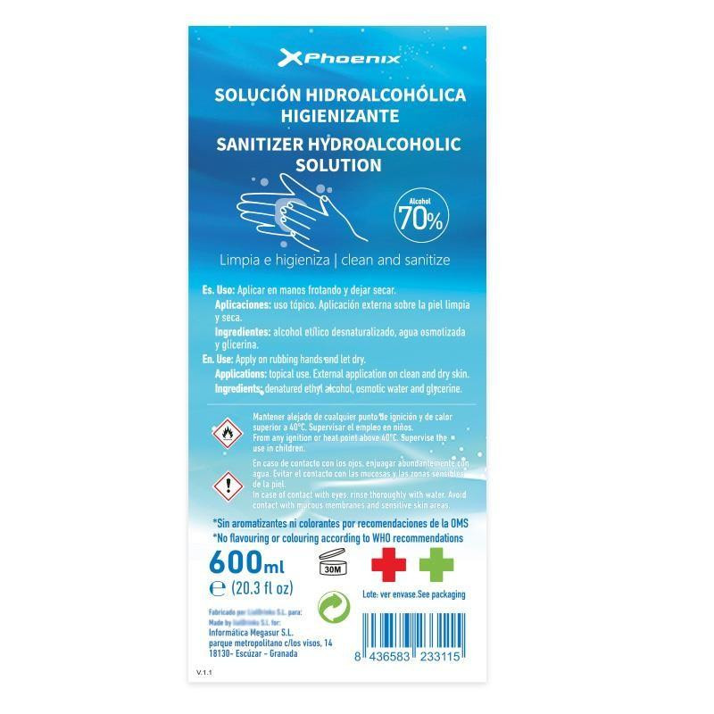 El gel hidroalcohólico Phoenix es una solución higienizante diseñada para mantener una limpieza óptima de manos y superficies. Su fórmula, con un 70% de alcohol, asegura una desinfección eficaz y rápida, eliminando gérmenes y bacterias.