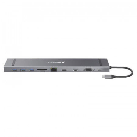 El Phoenix Dock Hub USB-C 11 en 1 es la solución perfecta para expandir la conectividad de tus dispositivos USB-C. Este dock ofrece una amplia gama de puertos, incluyendo HDMI 4K, VGA, USB 3.0, lectores de tarjetas SD y microSD, puerto Ethernet Gigabit y salida de audio de 3.5 mm, todo en un diseño compacto y elegante en color negro.