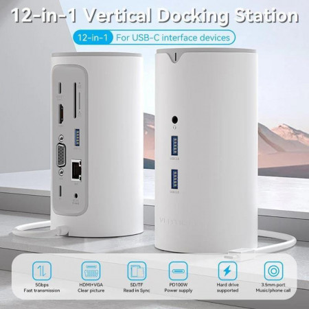 La Vention Docking Station 12 en 1 es una solución completa para ampliar la conectividad de tus dispositivos USB-C. Compatible con ordenadores, teléfonos y tablets equipados con USB-C 3.1 o superior, o con puertos Thunderbolt 3 o 4, esta docking station ofrece una amplia gama de puertos para conectar todo lo que necesitas.