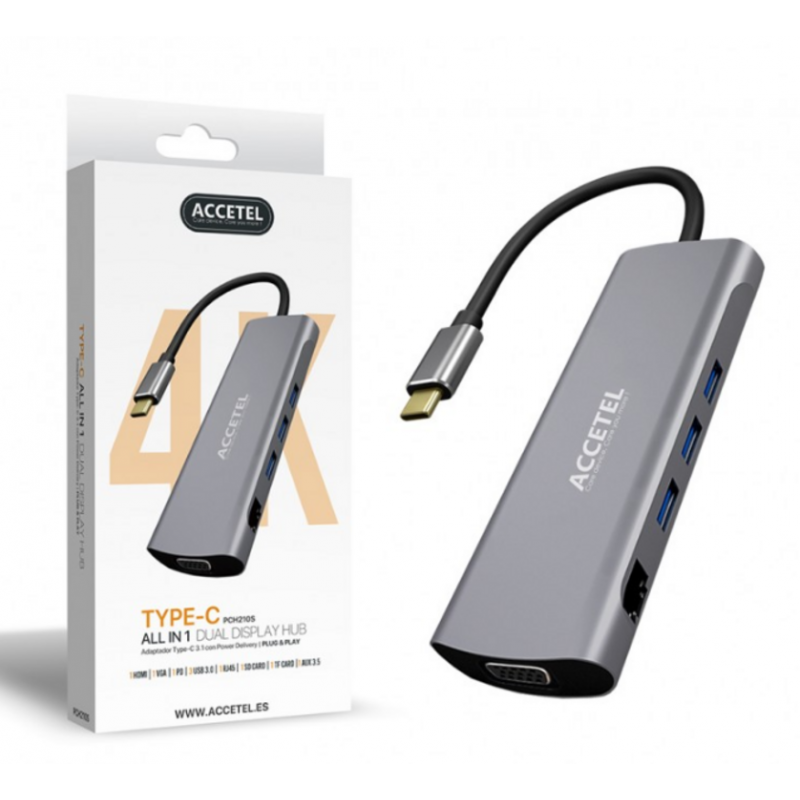 El Adaptador Accetel USB C 3.1 Hub Multifunción 10 en 1 (PCH210S) es la herramienta definitiva para ampliar la conectividad de tus dispositivos con puerto USB-C. Este versátil hub transforma un único puerto USB-C en una estación de trabajo completa, ideal para laptops, tablets y smartphones compatibles con USB-C.