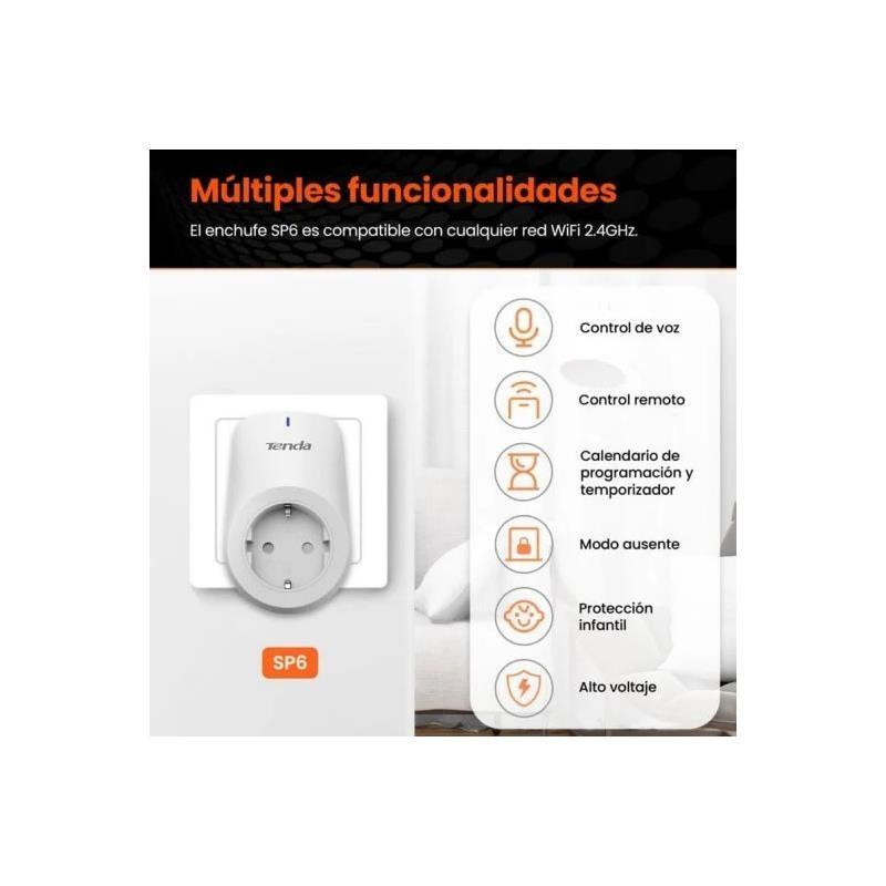 El Tenda SP6 es un enchufe inteligente que te permite controlar tus dispositivos electrónicos desde cualquier lugar utilizando tu smartphone. Este pack incluye dos unidades para que puedas empezar a automatizar diferentes áreas de tu hogar. Gracias a su conectividad WiFi de 2.4GHz, la configuración es rápida y sencilla.