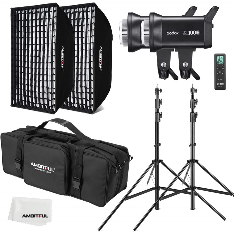 【Lista de productos】: 2 luces de vídeo LED SL100bi; 2 softboxes de 60 x 90 cm con montura Bowens y rejilla de panal; 2 soportes de luz de acero inoxidable de 2,8 m; 1 bolsa de transporte de 105 cm; 1 mando a distancia RC-A6