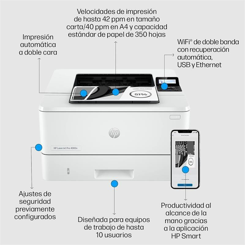 La HP LaserJet Pro 4002dn está diseñada para ofrecer una productividad excepcional en entornos de trabajo exigentes. Con velocidades de impresión rápidas y herramientas de gestión intuitivas, esta impresora te permite centrarte en lo que realmente importa: tu negocio.