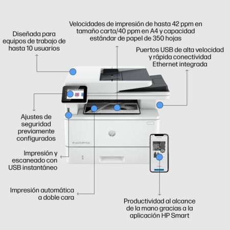 Características principales:- Máxima Productividad: Ideal para equipos dinámicos de hasta 10 usuarios, mejorando el flujo de trabajo con la velocidad de impresión profesional de HP.
