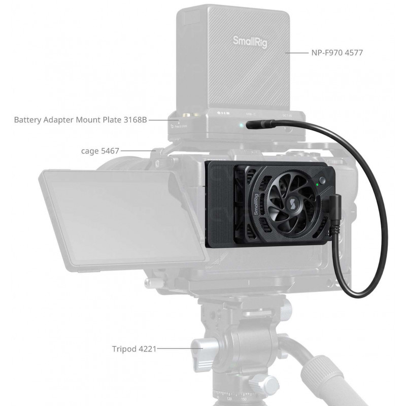 Para una mayor potencia y una refrigeración continua, el ventilador es compatible con los kits de placa de montaje de batería SmallRig V-Mount y las baterías V-Mount. Sin embargo, es importante tener en cuenta que la pantalla LCD de la cámara no se puede retraer con el ventilador instalado, y el producto debe estar conectado a una fuente de alimentación externa para funcionar. Además, no es resistente al agua y no debe utilizarse en ambientes húmedos. Se debe tener cuidado de no obstruir la entrada ni la salida de aire durante su uso.