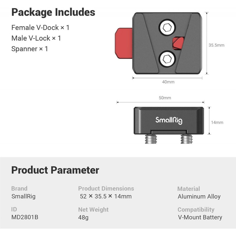 El kit de montaje SmallRig Mini V-Lock MD2801 es un conjunto de liberación rápida basado en el V-Lock estándar. Viene con un V-Dock femenino y un V-Lock masculino. Hay 2 orificios de montaje de 1/4-20 en el V-Dock hembra y puede conectar este conjunto directamente a un kit de jaula para cámara SmallRig, un marco de monitor SmallRig o un soporte para hombrera SmallRig. Además, puede montar este kit de ensamblaje en la bisagra de batería SmallRig MD2802, que está diseñada para ajustar el ángulo de la batería con esta configuración para alimentar todos los accesorios, lo que minimiza el peso de la cámara. El V-Lock con tres orificios M3 se puede utilizar como reemplazo del V-Lock original que viene con la batería V-Mount.