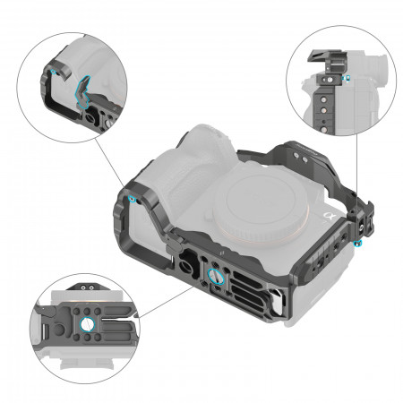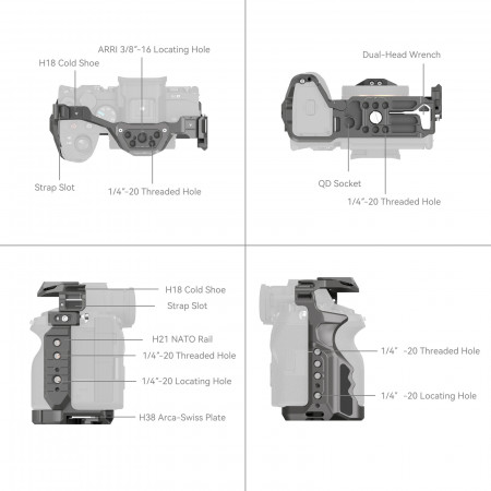 · Sistema de bloqueo de triple punto: garantiza una fijación segura de la cámara mediante un pasador de ubicación inferior, un tornillo de 1/4 "-20 y un tornillo M2.5.