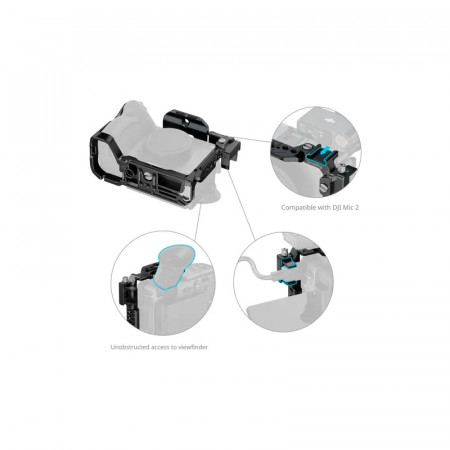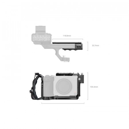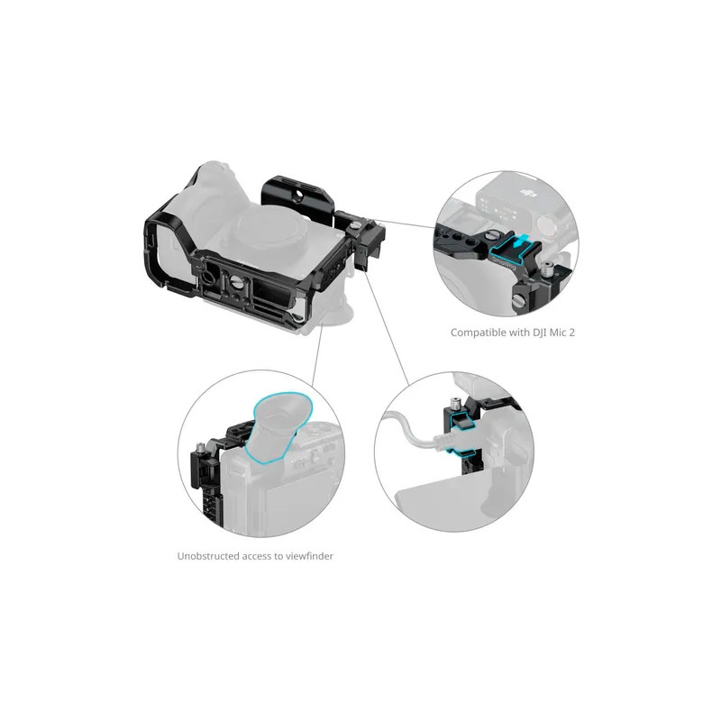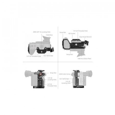 La placa superior extraíble incorpora un raíl NATO, adecuado para la empuñadura XLR de Sony o la empuñadura giratoria de SmallRig (SmallRig ID 4152) sin interferir con el visor electrónico. La jaula cuenta con múltiples puntos de montaje, incluidos orificios para tornillos de 1/4"-20, orificios de montaje ARRI de 3/8"-16 y un raíl NATO "HawkLock" para acoplar rápidamente accesorios opcionales como empuñaduras laterales (SmallRig ID 4485) y empuñaduras superiores (SmallRig ID 4483). Un accesorio de zapata de frío permite acoplar dispositivos como el DJI Mic 2 o luces LED, mientras que un conector QD en la parte inferior se adapta a las correas de hombro para mejorar la portabilidad. La base también está equipada con una llave Allen magnética, lo que permite un rápido montaje y desmontaje.