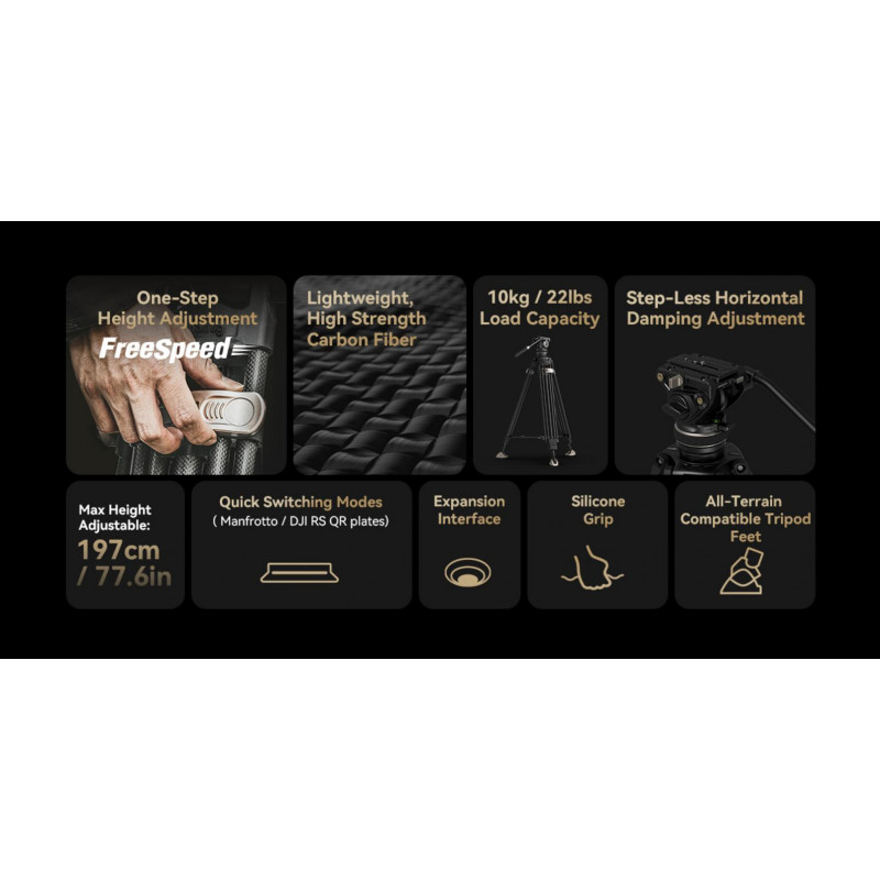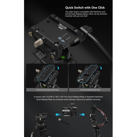 Cuenta con una montura de placa de liberación rápida de diseño innovador, más eficiente que los sistemas deslizantes tradicionales, compatible con las placas de liberación rápida de DJI RS 2 / RS 3 / RS 3 Pro y Manfrotto, permitiendo un cambio rápido entre la estabilización y el uso del trípode. Incorpora un mango telescópico desmontable para facilitar su almacenamiento y uso, adecuado tanto para usuarios diestros como zurdos. El cabezal de video también dispone de un orificio roscado de 1/4"-20 para montar brazos mágicos y otros accesorios, así como una llave integrada para instalar y desmontar la cámara.
