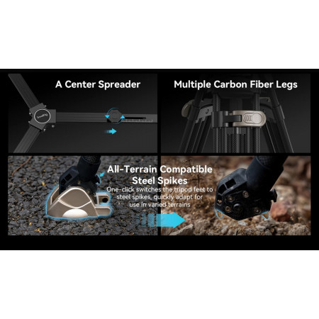- Patas de trípode de fibra de carbono, ligeras y robustas, con pies anchos (de goma) y pies de punta intercambiables según el terreno.