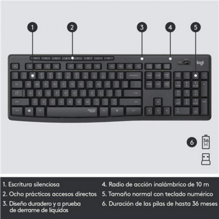 - Larga duración de la batería: Olvídate de cambiar las pilas constantemente con una duración de batería de hasta 36 meses para el teclado y 18 meses para el ratón.