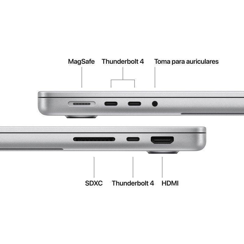 - Conectividad completa: Tres puertos Thunderbolt 4, puerto de carga MagSafe 3, ranura para tarjetas SDXC, puerto HDMI y toma para auriculares. Admite hasta dos monitores externos.