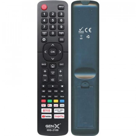 El Mando Universal Grande Gen-X HIG-2109 está diseñado específicamente para ofrecer una compatibilidad perfecta con una amplia gama de televisores Hisense, incluyendo los modelos Smart TV. Olvídate de complejas configuraciones o la búsqueda de códigos; este control remoto está preprogramado y listo para funcionar directamente al insertar las pilas (no incluidas).