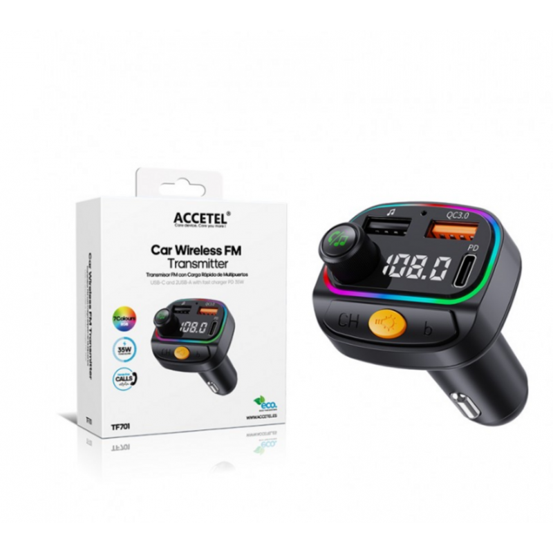 El transmisor Accetel FM Bluetooth TF701 es la solución definitiva para modernizar el sistema de entretenimiento y carga en tu vehículo. Diseñado para ofrecer una integración perfecta, este dispositivo te permite disfrutar de tu música favorita desde tu smartphone a través de la radio FM de tu coche, así como realizar llamadas con total seguridad gracias a su función manos libres.