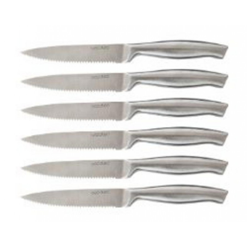 Equipa tu cocina con el set de cuchillos CECOTEC Profesionales de Carne. Incluye 6 unidades con sierra, mango y hoja forjados en una sola pieza de acero para un corte preciso y duradero. ¡Calidad profesional en tu hogar!