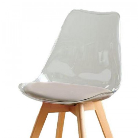 - Materiales de alta calidad: Patas macizas de madera y asiento de policarbonato transparente.