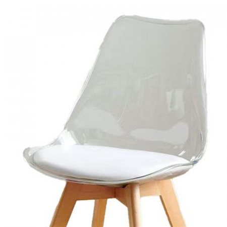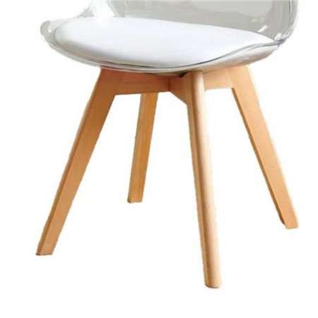 Cada silla de este pack está construida para ofrecer durabilidad y confort. Dispone de una robusta estructura con patas macizas de madera de haya, garantizando estabilidad y una larga vida útil. El asiento, fabricado en policarbonato transparente, no solo es estéticamente atractivo, sino también fácil de limpiar y resistente. Para maximizar la comodidad, cada silla incluye un cojín acolchado de color blanco en la base, que complementa a la perfección su estética.