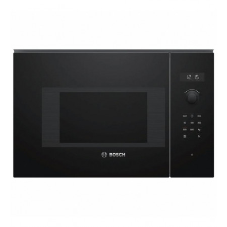 El microondas integrable Bosch BFL524MB0 es la elección ideal para quienes buscan funcionalidad, diseño y facilidad de uso en su cocina. Diseñado para integrarse a la perfección en cualquier mueble, su elegante acabado en cristal negro y su display LED con luz blanca aportan un toque moderno y sofisticado.