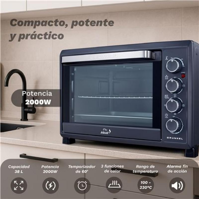 El horno eléctrico de convección Grunkel HR-38PRO es la solución perfecta para quienes buscan funcionalidad y eficiencia en un espacio compacto. Con una generosa capacidad de 38 litros, es lo suficientemente amplio para preparar una variedad de comidas, desde asados hasta repostería, convirtiéndose en un aliado indispensable en tu cocina.