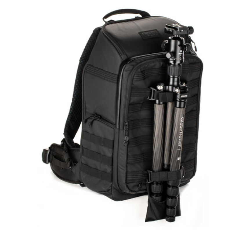 Los trípodes y cardanes se pueden sujetar a la parte delantera de la mochila con las correas de seguridad incluidas o se pueden guardar en el bolsillo lateral reforzado.