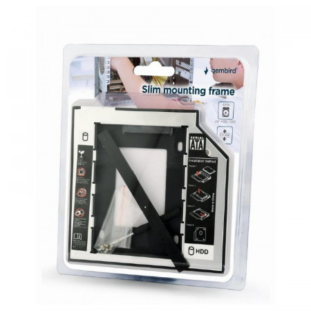 Este práctico marco de montaje delgado de Gembird permite instalar un disco duro SATA de 2.5'' adicional en la ranura SATA delgada de 5.25'' disponible en su PC o portátil. Diseñado para ser instalado en lugar de la unidad de DVD-ROM, este adaptador le permite aprovechar al máximo su espacio disponible.