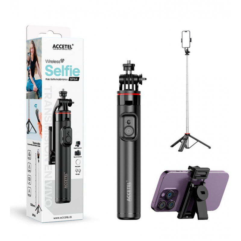 El Palo Selfie Inalámbrico Accetel SP164 es la herramienta perfecta para inmortalizar tus recuerdos con la máxima comodidad y versatilidad. Diseñado para ofrecer una experiencia de usuario superior, este accesorio multifuncional se extiende hasta 1.32 metros, permitiéndote capturar un ángulo más amplio y encuadres creativos que un brazo no podría alcanzar.