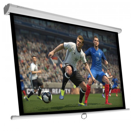 Su tela blanca mate de alta calidad garantiza una reproducción de colores precisa y vibrante, mientras que su cajetín de acero proporciona durabilidad y estabilidad. La pantalla se despliega fácilmente tirando de la anilla, permitiendo ajustarla a diferentes formatos: 1:1, 4:3 y 16:9.