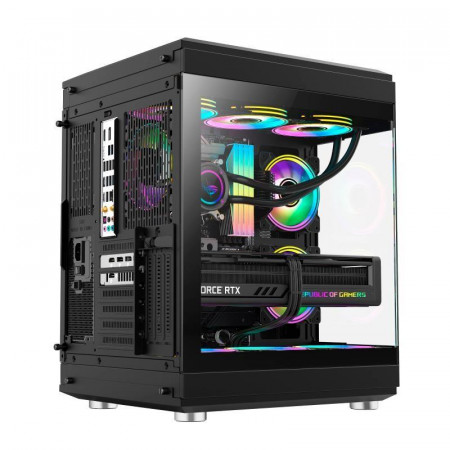 El diseño panorámico en vidrio templado permite lucir los componentes internos, mientras que los tres ventiladores Infinity ARGB Dual-Ring aseguran una refrigeración óptima. Además, la refrigeración líquida para la CPU Iceberg ARGB de 240mm mantiene el procesador a una temperatura ideal incluso durante las sesiones de juego más intensas.