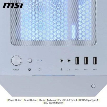 | Conectores Panel Frontal | 1x USB 3.2 Gen 1 (Tipo-A), 2x USB 2.0, 1x salida de audio, 1x entrada de micrófono, botones Power/Reset, botón LED (RGB) |