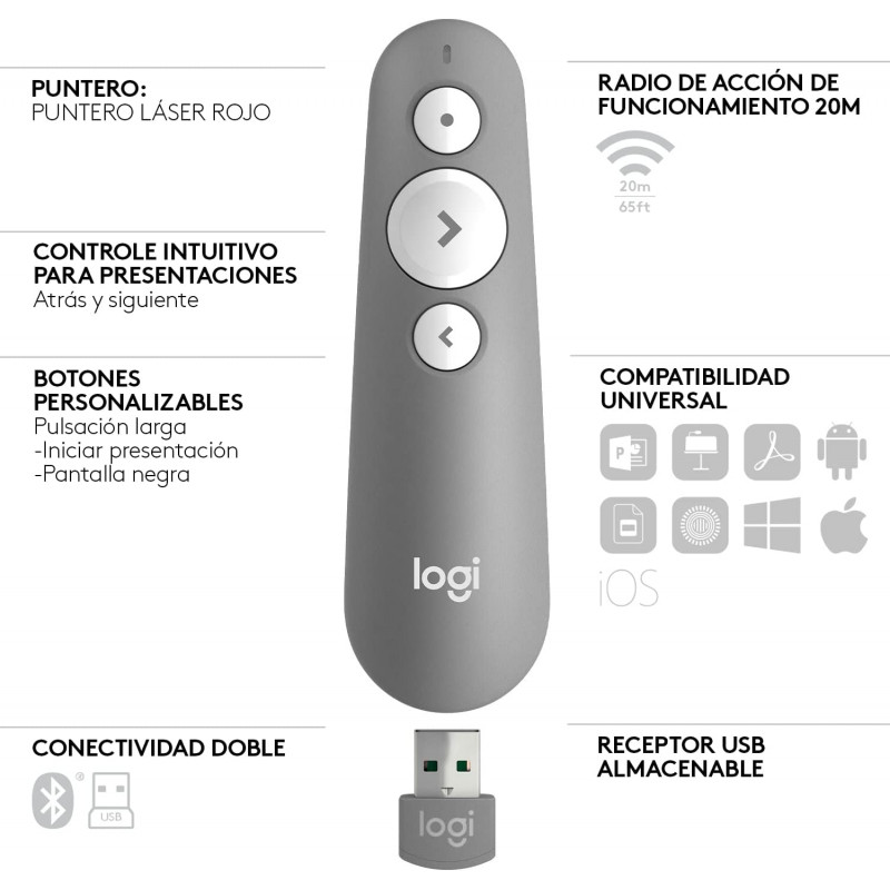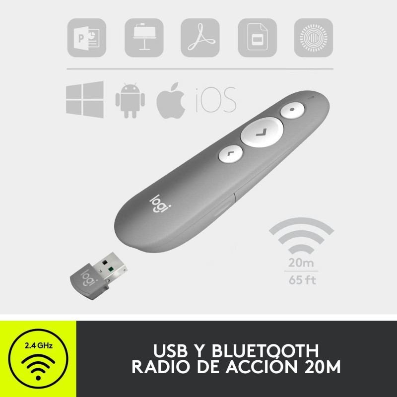 El mando R500s láser de Clase 1 se ha optimizado para funcionar con Windows, macOS, iOS, Android, y también con software de presentación como PowerPoint, Keynote, PDF, Google Slides y Prezi.