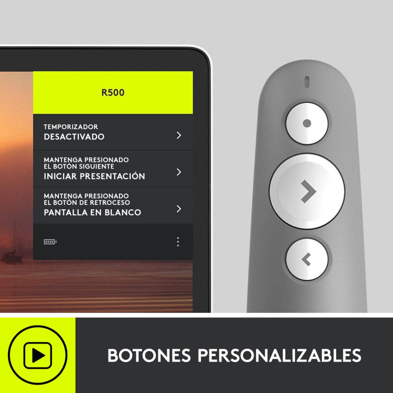 El mando R500s se empareja con la eficaz aplicación Logitech Presentation para permitir personalizar funciones de botones, controlar el estado de carga de la pila y programar un temporizador de presentación en pantalla.