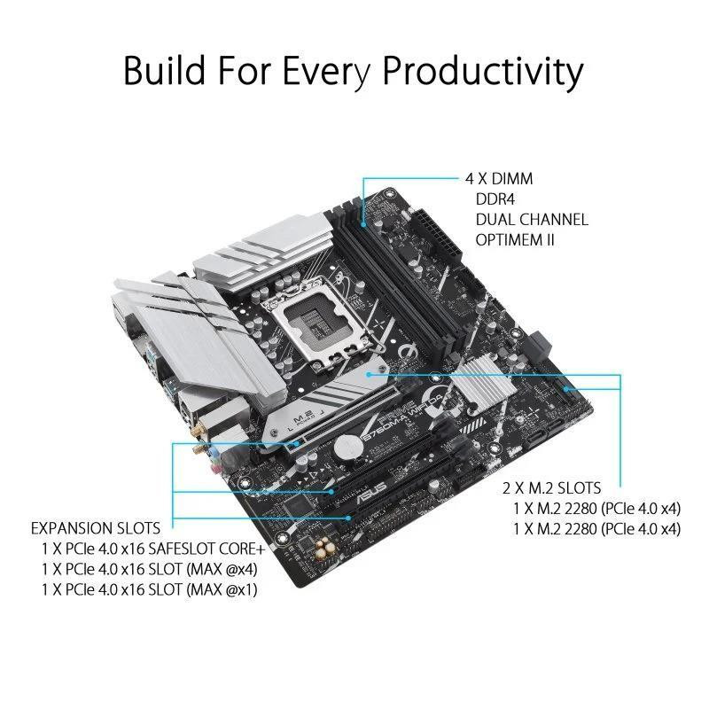EAN 4711081982661La placa base ASUS PRIME B760M-A WIFI D4 está diseñada para los procesadores Intel Core de 12ª y 13ª generación, ofreciendo una base sólida para un sistema potente y versátil. Perfecta para usuarios que buscan un rendimiento constante y una fiabilidad duradera.