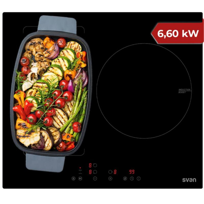 La placa de inducción Svan SIFZ3600 ofrece una experiencia culinaria avanzada y segura, combinando un diseño moderno con alta funcionalidad. Su elegante acabado en cristal negro la convierte en una pieza central atractiva para cualquier cocina, sin sacrificar el rendimiento.