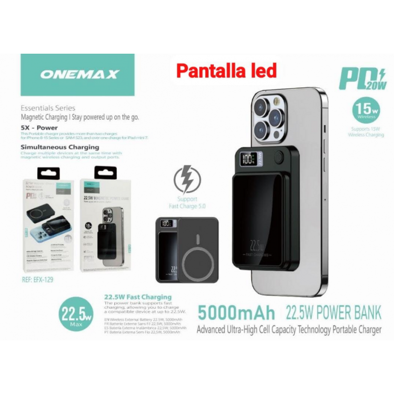 El Powerbank Onemax EFX-129 es la solución definitiva para mantener tus dispositivos cargados en cualquier lugar. Este cargador portátil combina la tecnología avanzada MagSafe con una potencia de 22.5W y una capacidad de 5000mAh, garantizando una carga rápida y segura para tus smartphones, especialmente para los modelos de iPhone compatibles con MagSafe.