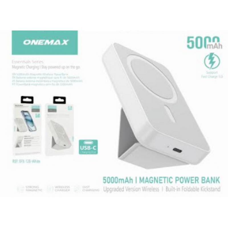 El Powerbank Magnético Inalámbrico Onemax MagSafe EFX128 es la solución ideal para mantener tus dispositivos cargados en todo momento. Con una capacidad de 5000mAh, este cargador portátil ofrece una carga rápida y eficiente para tu iPhone compatible con MagSafe y otros dispositivos compatibles con carga inalámbrica Qi.