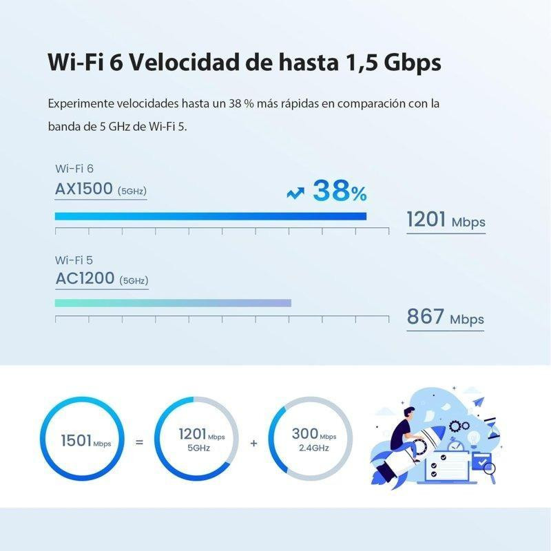 - Tecnología Wi-Fi 6 AX1500: Alcanza velocidades de hasta 1501 Mbps (5 GHz: 1201 Mbps + 2.4 GHz: 300 Mbps), superando en un 38% la velocidad de los sistemas AC1200.